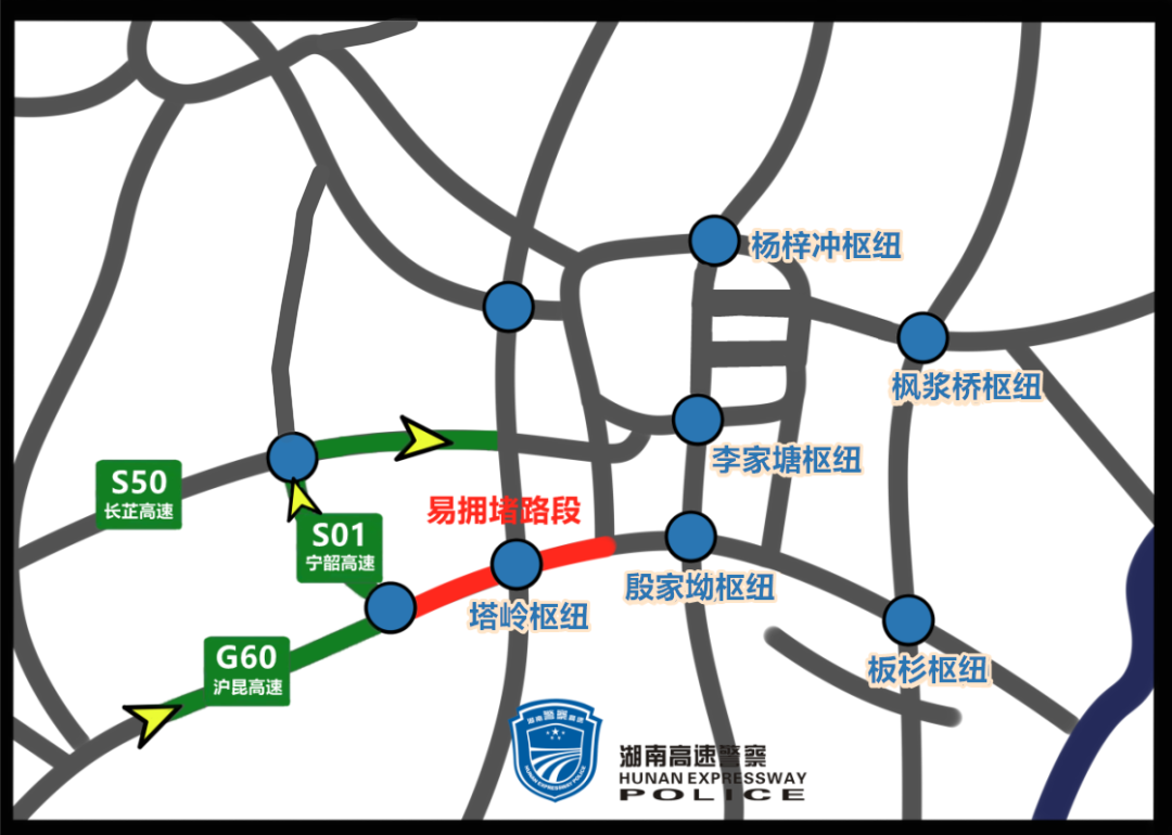 G4京港澳和G60沪昆高速交汇的殷家坳枢纽路段。易缓行枢纽预测