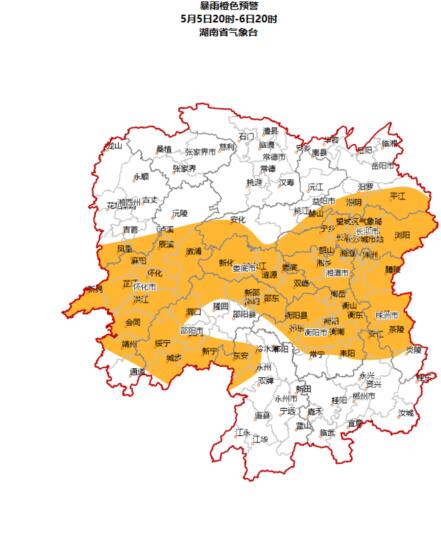 星辰在线5月5日讯 据(长沙晚报掌上长沙全媒体记者 张洋子 通讯员 林城)消息 强降雨再度来袭!湖南省气象台5日16时发布暴雨橙色预警:预计5日20时至6日20时,长沙、株洲、湘潭、衡阳、邵阳、岳阳南部、益阳西南部、永州西北部、怀化、娄底部分地区将出现暴雨,局地大暴雨,并伴有短时强降水、雷雨大风等强对流天气,请加强防范。