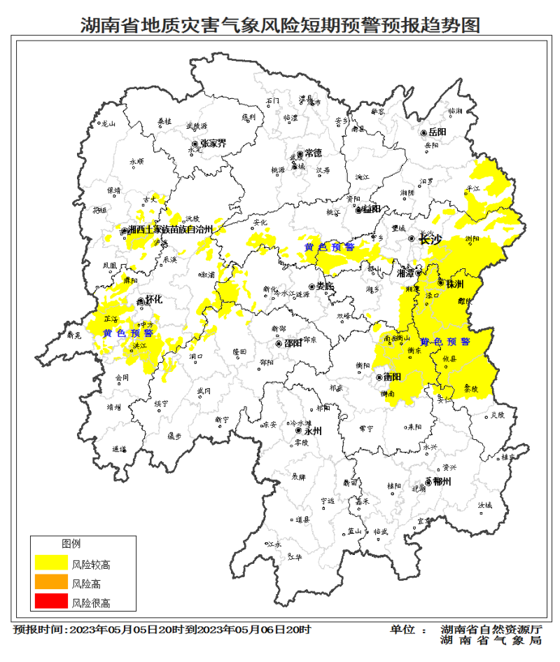 湖南省自然资源厅与湖南省气象局同时联合发布地质灾害气象风险预警:5月5日20时至6日20时,受降雨影响,湘中、湘西、湘东大部分区域发生突发性地质灾害风险较高(黄色预警)。