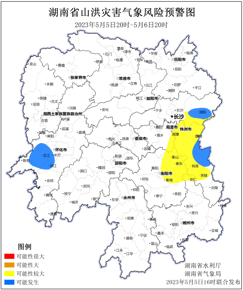 湖南省水利厅与湖南省气象局下午发布山洪灾害气象风险预警:自5月5日20时至6日20时,受降雨影响,怀化市中部、长沙市东部、株洲市东部等局地可能发生山洪灾害(蓝色预警),衡阳市东部、郴州市北部、株洲市大部、长沙市东南部、湘潭市东部等局地发生山洪灾害的可能性较大(黄色预警)。