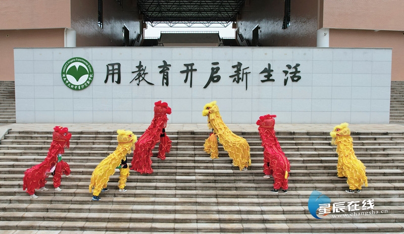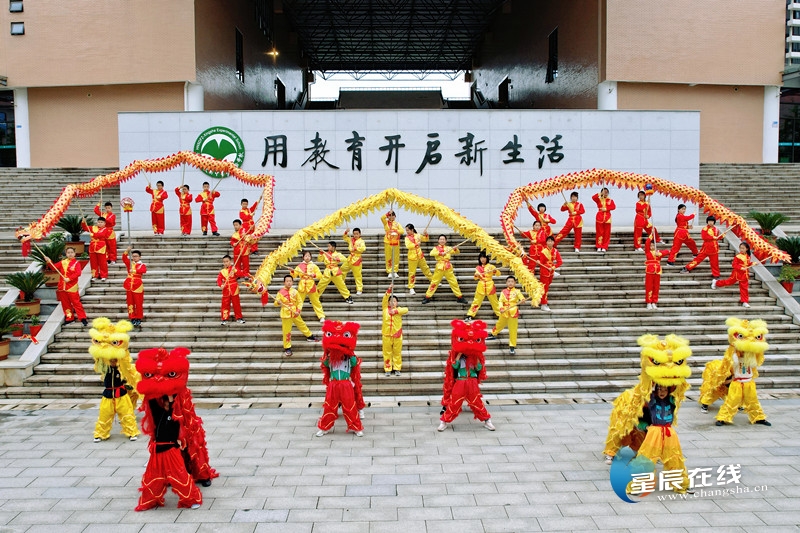 (湖南师大附中星沙实验学校同学们表演舞龙舞狮。)