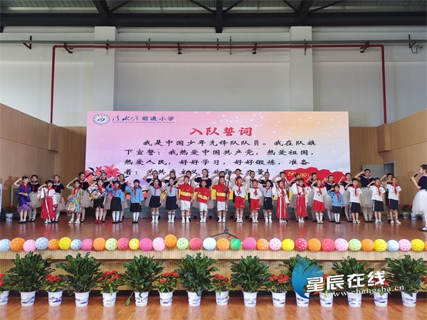 星辰在线5月30日讯(星辰全媒体记者 张奇涛)“我是中国少年先锋队队员。我在队旗下宣誓:我热爱中国共产党,热爱祖国,热爱人民,好好学习,好好锻炼,准备着:为共产主义事业贡献力量!”5月30日,长沙市开福区清水塘前进小学,一批新入少先队员庄严宣誓、一个个精彩节目内容在小朋友们心中种下正能量的种子。
