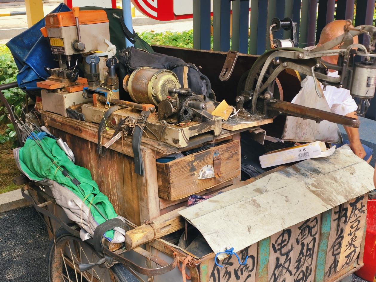 “这里有钥匙机、打磨机、缝鞋机等,还有零散的50多种工具。”据戴超介绍,一辆倒三轮脚踏车内,有小到钢钉、剪丝钳,大到缝补机器、户外遮阳伞,甚至连角磨机等“重器”一应俱全。