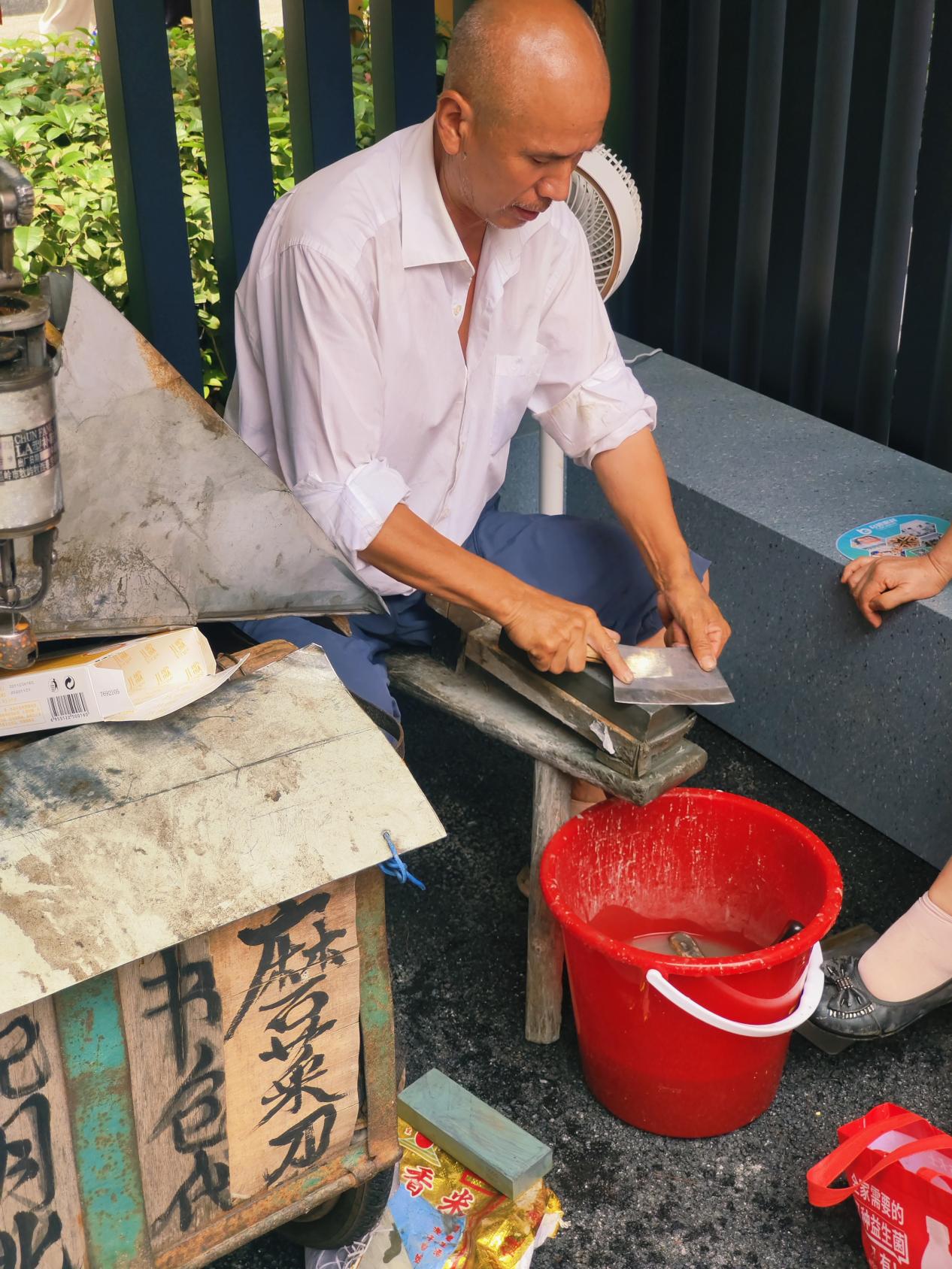 “磨剪子嘞戗菜刀”,浑厚悠扬的叫卖声,总能吸引一群懂行的爹爹娭毑围拢过来,他们慢慢悠悠地拉家常,口里嘱咐着,“老师傅您家过点细,磨好罗。”拿钢砂磨刀石搞两下是很省事,三两下就好,但是就是没有小目数的水磨石,花一两个钟头细磨出来的有劲道,不卷口还趁手。“家里的菜刀就是要开刃,还得是老师傅手工磨才经用……”。