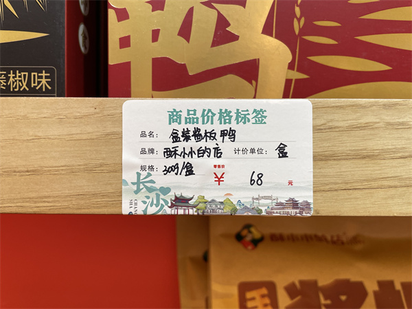 (长沙太平历史文化街区的一家湘式特产店里,商品酱板鸭被贴上了统一的“价格标签”。)