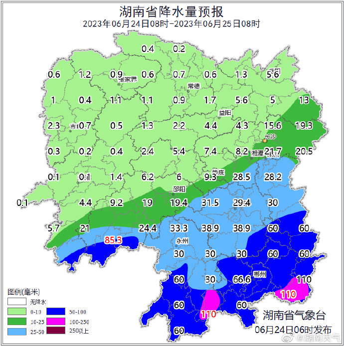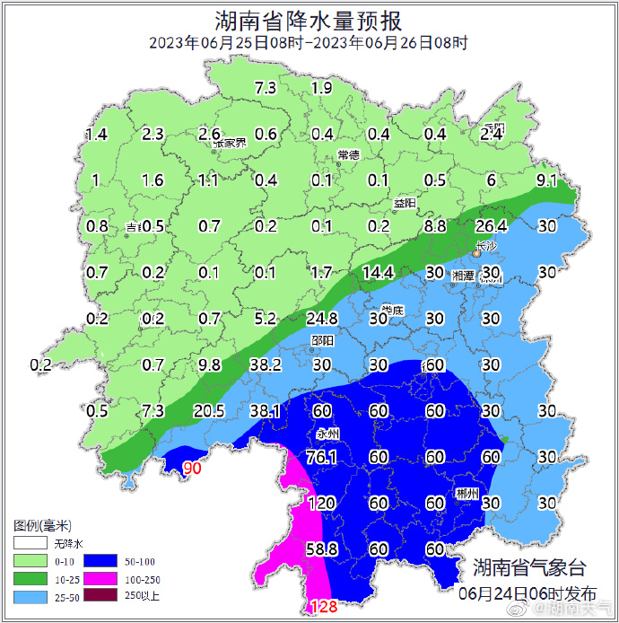 星辰在线6月24日讯 据(湖南天气)消息 湖南省预计24日至25日,受高空槽、中低层低涡切变及地面冷空气共同影响,湘南部分地区仍有有暴雨到大暴雨,并伴有短时强降水、雷暴大风等强对流天气;26日降水减弱,全省大部分地区有小到中等阵雨或雷阵雨,局地大雨。