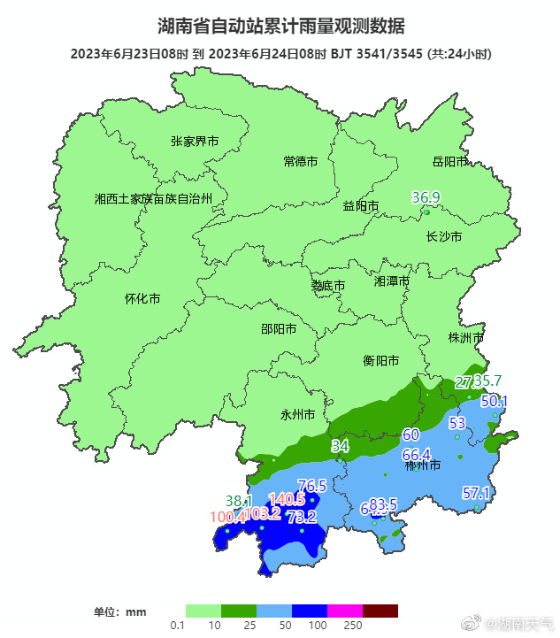 23日08时至24日08时,较强降雨主要出现在永州、郴州、株洲南部等地,株洲(炎陵)、永州(道县、江永、蓝山、宁远、江华、新田)、郴州(临武、北湖区、苏仙区、嘉禾、宜章、汝城、安仁、资兴)共15个县市区135站累计雨量超过50毫米,永州(江永、道县、江华)3个县8站超过100毫米,最大为道县横岭乡140.5毫米;小时雨强最大为江华大路铺35.8毫米(23日18时至19时)。