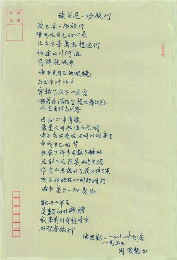 (书友周俊慧女士在信封上手写的原创诗歌。以上短视频和图片均由主办方提供)