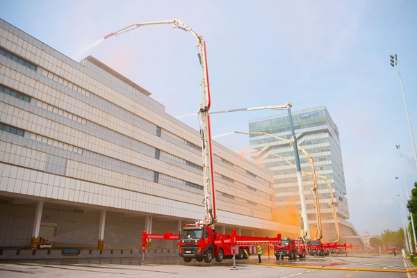 (喷射消防车并排停靠于起火仓库北面,向北面外墙出水降温。)