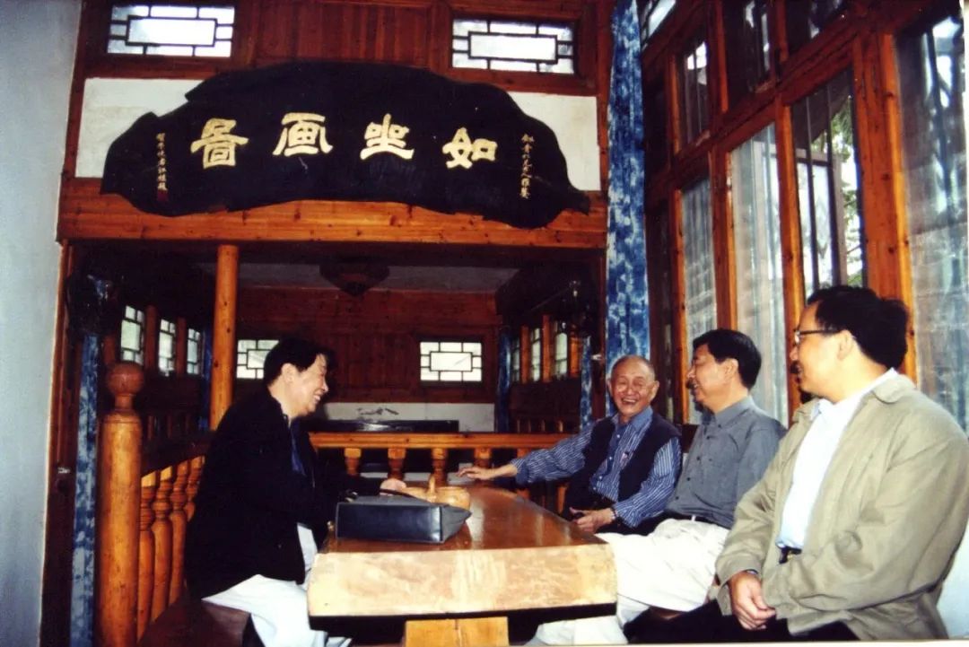 (武吉海(右一)、金述富(右二)在凤凰古城夺翠楼陪同湖南省委原书记熊清泉(左一)看望黄永玉先生(右三)。)