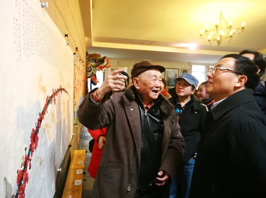( 黄老在凤凰玉氏山房堂屋向来客介绍他创作的“独占一枝春”梅花图。)