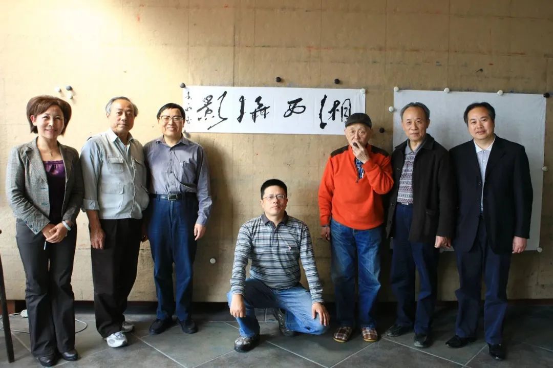 ( 2011年,黄老在凤凰玉氏山房帮湘西州摄影家协会题写“湘西摄影”(左起:江国娥、刘鸿洲、武吉海、张谨、黄永玉、龙颂江、吴彦承)。)