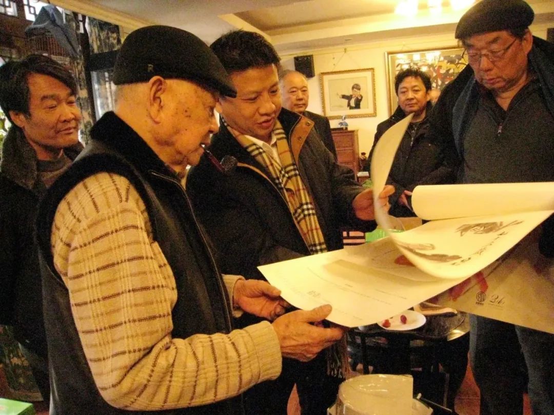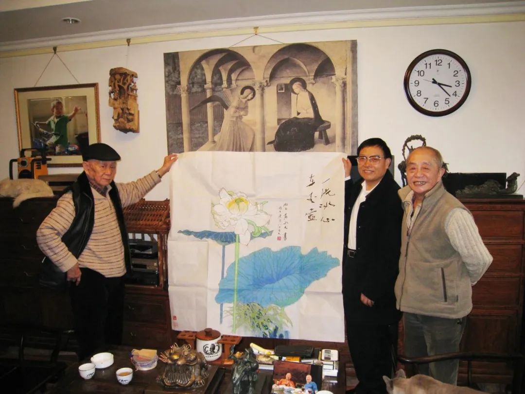 (黄老展示他创作的“一片冰心在玉壶”荷花图,意喻高洁(右一:黄老二弟黄永厚先生)。)