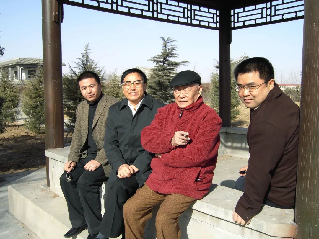 (2006年春,作者与时任凤凰县县长、第十届全国人大代表张永中(右一)到北京通州万荷堂看望黄永玉先生。)