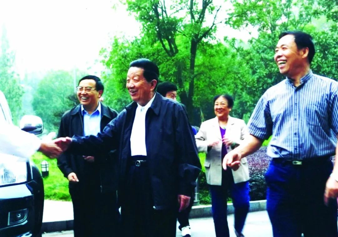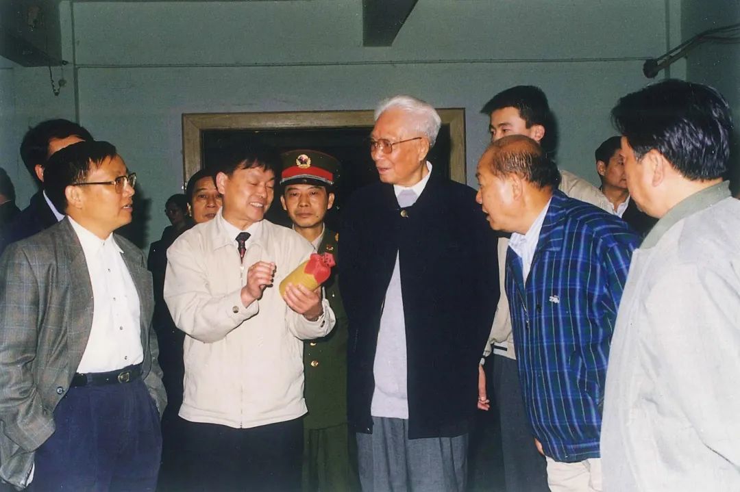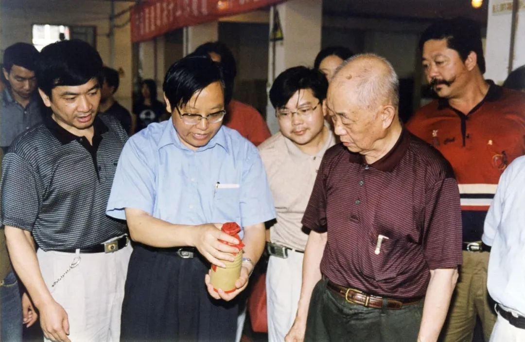湘泉集团董事长王锡炳在生产车间向中央军委原副主席张震介绍湘泉酒产品(前排左起:武吉海、王锡炳、张震、董志文、彭对喜)。()