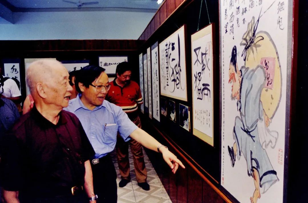 (作者陪黄永玉先生参观湘泉艺术馆,观看黄老创作的《酒鬼背酒鬼》画作。)