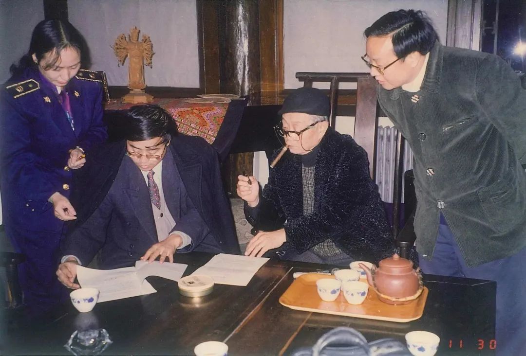 (黄永玉先生与湘西州公证处同志在北京万荷堂审看捐赠给酒鬼公司湘泉、酒鬼商标和瓶型设计以及字画协议(左三:黄永玉 左四:武吉海)。)