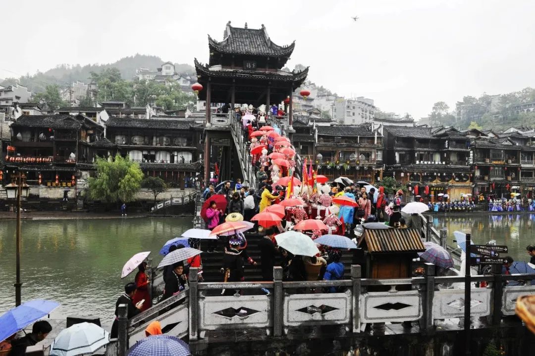 (黄永玉先生捐建在凤凰沱江上的风雨桥,旅游旺季时,人来人往。)