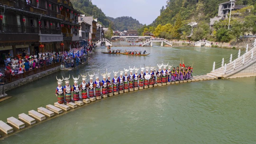(黄永玉先生捐建给凤凰的4座景观桥,成为摄影发烧友取材创作的新视角,这是吕有齐在中国凤凰银饰服饰文化节期间拍摄的《沱江儿女》。)
