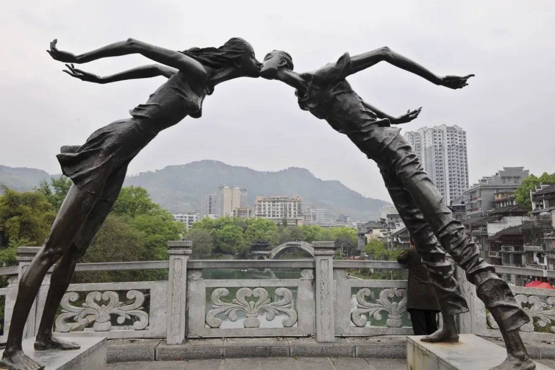 ( 黄永玉先生捐建在吉首峒河上的“爱桥”及铜铸雕塑,造型奇妙。)