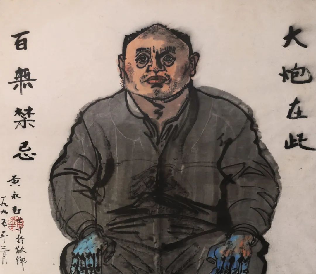( 黄永玉先生为凤凰蓝印花布技艺国家级非遗传承人刘大炮画的肖像,题有:大炮在此,百无禁忌。)