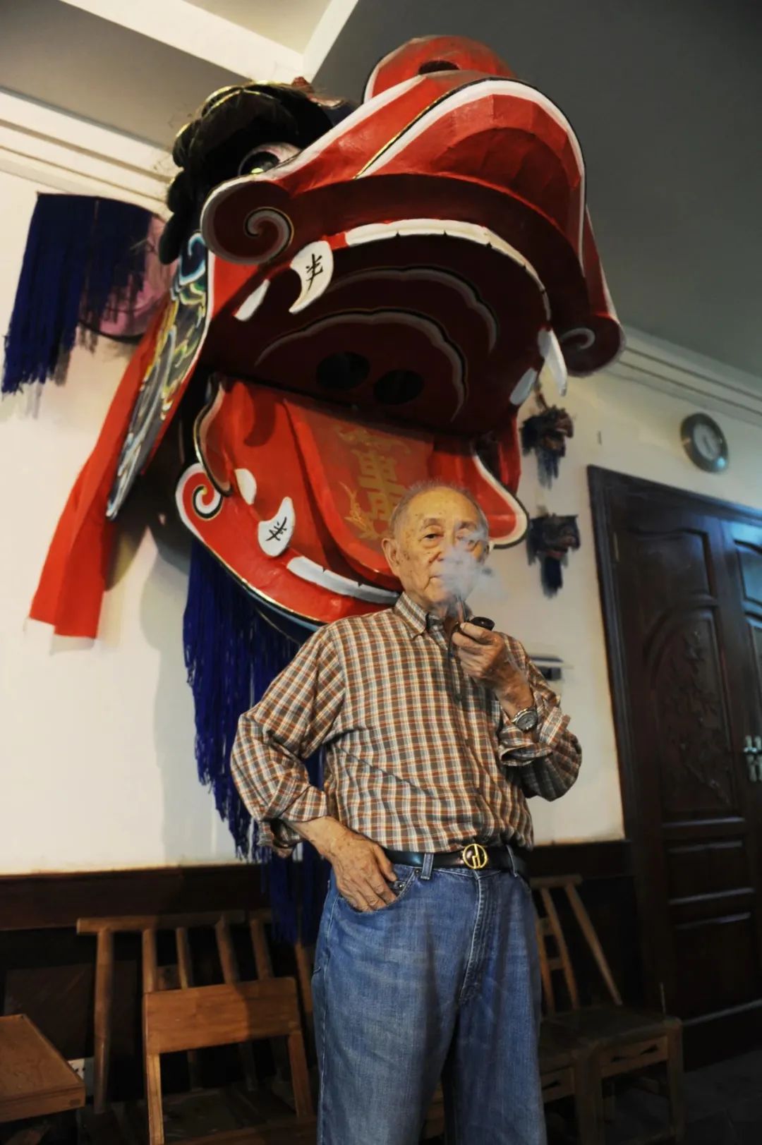 (黄永玉先生欣赏凤凰纸扎技艺国家级非遗传承人聂胡子的作品,他购买聂胡子制作的纸扎彩狮头装饰玉氏山房堂屋。)