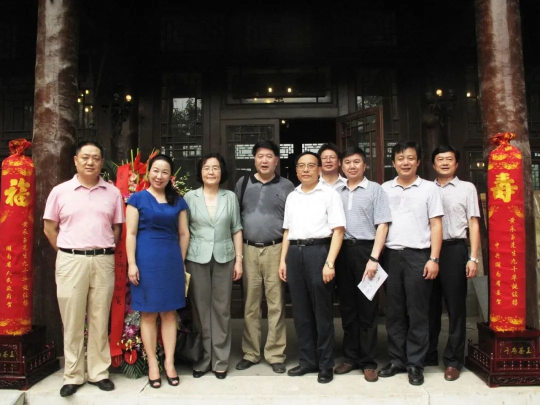 (2013年8月,时任湘西州州长郭建群(左二),吉首大学党委书记游俊(右三),州委常委、吉首市委书记秦国文(右二),市长李卫国(右四),吉首市负责联系修桥的常务副市长王跃(右一)等到北京通州万荷堂看望黄老。)