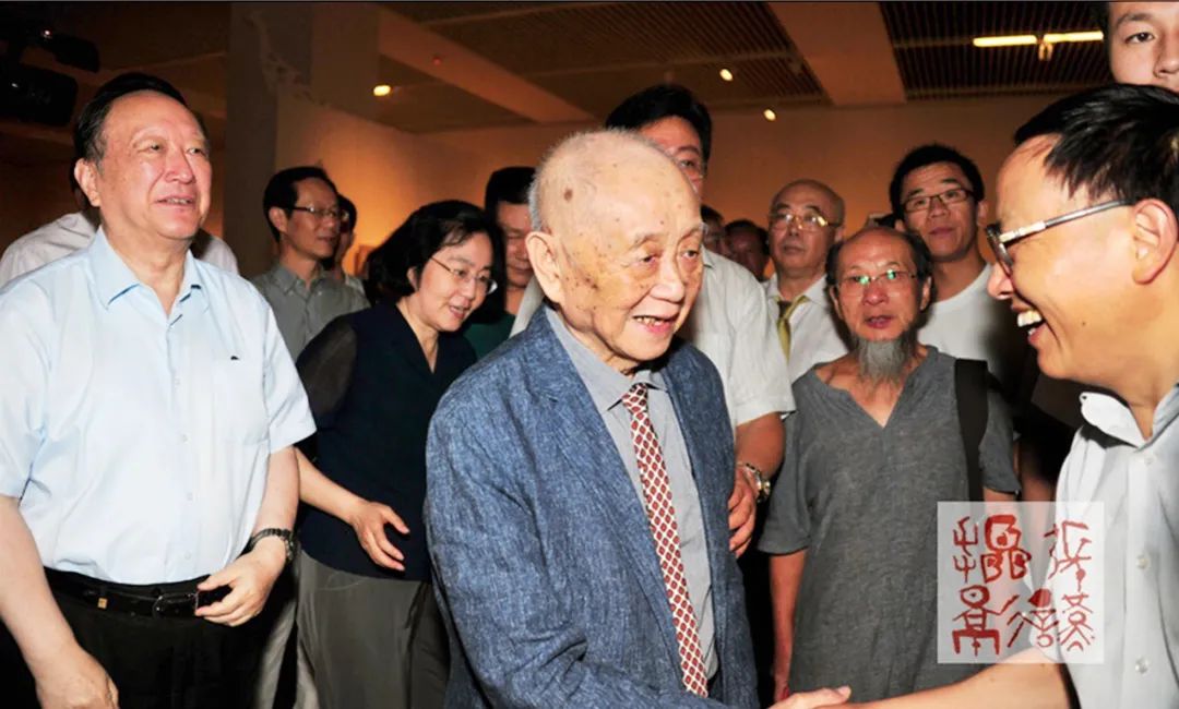 ( 2013年8月,作者(右一)与罗海燕(左二)陪同时任全国政协副主席徐匡迪(左一)和黄永玉(左三)参加在中国国家博物馆举办的“黄永玉九十画展”。)