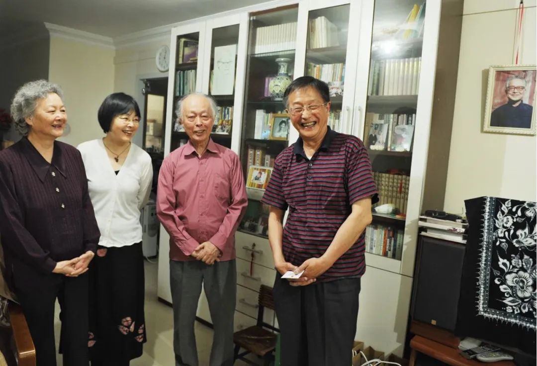 (2012年 ,北京沈虎雏家,沈从文长子沈龙朱(右一)、次子沈虎雏(右二)、二儿媳张之佩(右四)、孙女沈红(右三)在一起闲聊,右上方墙上挂有沈从文像。)