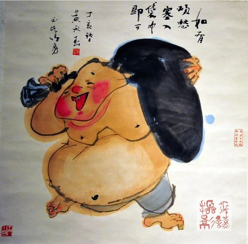 (黄老人物画:如有烦愁,塞入袋中即可。)