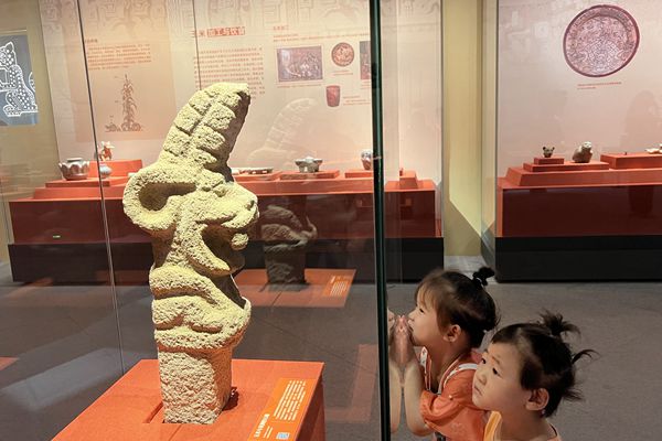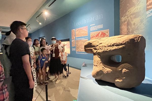 (志愿讲解员在向放暑假的小朋友介绍古代墨西哥石雕。)