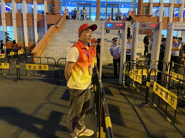 (湖南省第十届少数民族传统体育运动会现场,韦顺江开展志愿服务。)