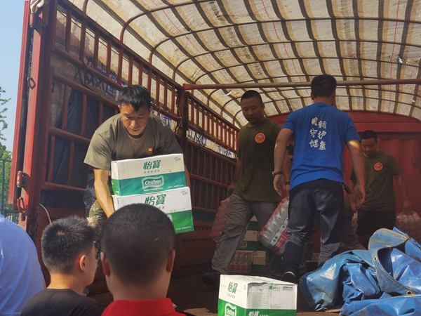 (2021年河南抗洪救灾救援现场,韦顺江(左一)正在分发救援物资。)