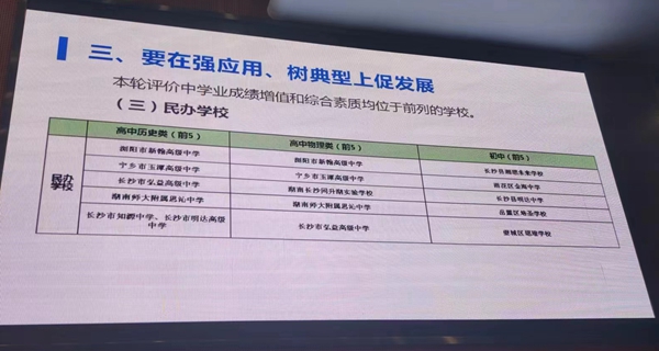 在民办学校的学业成绩增值和综合素质的评价中,高中办学分为物理类和历史类两类,物理类评价中,宁乡市玉潭高级中学等6所学校上榜(两所学校并列第五);历史类评价中,宁乡市玉潭高级中学等5所学校上榜。