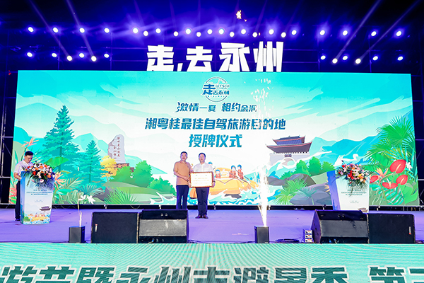 开幕式上,湖南省自驾旅游与房车露营协会会长杨国林为金洞旅游区授予“湘粤桂最佳自驾旅游目的地”牌匾。