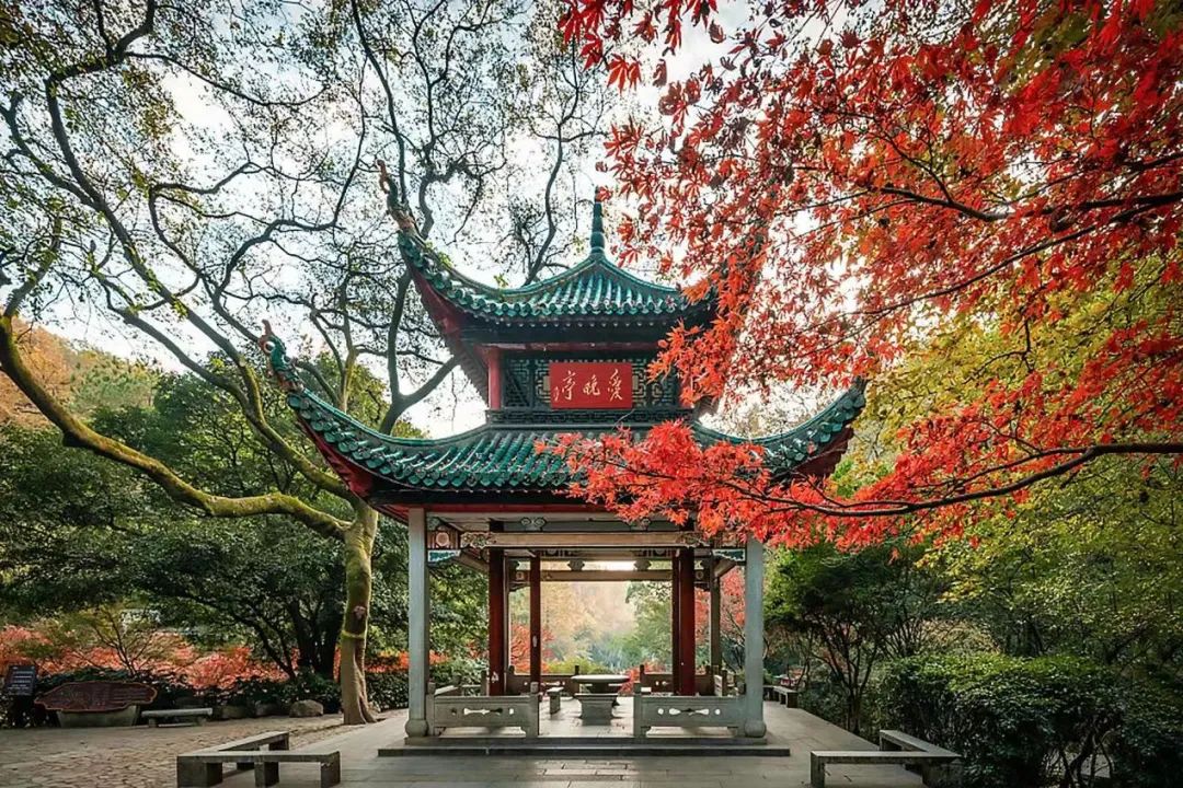 (爱晚亭,原名红叶亭,坐落于岳麓山半山腰,四周皆枫林,深秋枫叶红艳。得名于“停车坐爱枫林晚,霜叶红于二月花”诗句。)