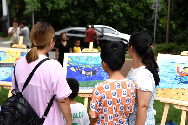 (家长和孩子正在欣赏防溺水主题画展。)