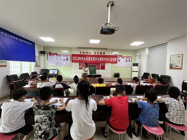 (7月份,天心区暮云新村分馆开展少儿硬笔书法公益培训。)