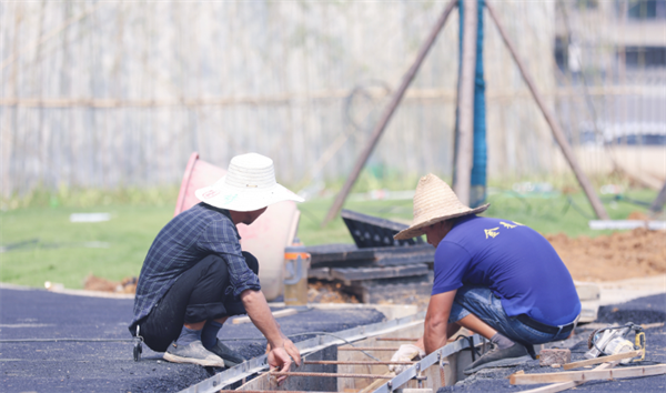 (雅礼洋湖会展中学扫尾阶段,施工人员冒着酷暑加快进度,确保秋季顺利开学。)