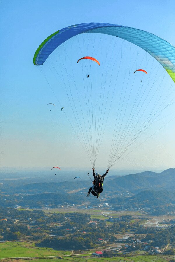 (游客在黑麋峰滑翔伞基地体验一飞冲天的快乐。照片除署名外,均为景区提供)