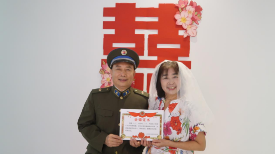“我能想到最浪漫的事,就是和你一起慢慢变老”,为拍好这张“金婚照”,金婚夫妇们做足了准备,空军航空兵退休的候玉贤爷爷再次穿上了军装,朱文彬爷爷带上了1968年的结婚证......虽然没有华丽的语言,但脸上洋溢出的笑容让在场的人都感受到了他们的爱意,现场被温馨、和谐、幸福的气氛包围着。
