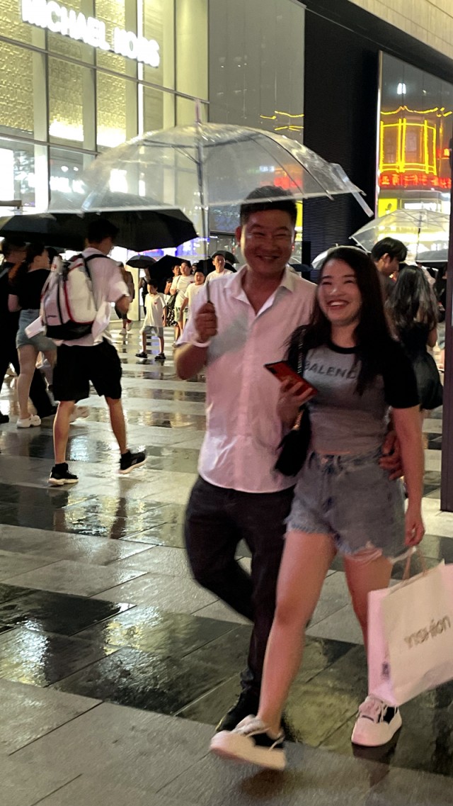(一对情侣走在雨中,脸上洋溢着幸福。)