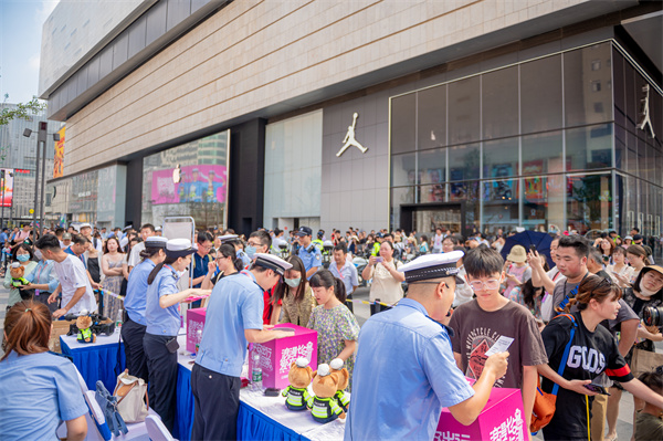 同时,长沙交警还在国金中心前坪设置了普法互动打卡点,由长沙交警的形象代言人石文宇、高队长(高朝峰)、小警妹妹(付立)开展交通安全普法宣传。现场开展有奖互动答题,回答正确的市民可得到一只可爱的“交警小熊”。一旁,还有两名憨态可掬的“交警小熊”真人玩偶向市民发出“请抱抱熊”的邀请,与市民打卡互动,展示交警亲民、爱民的形象。