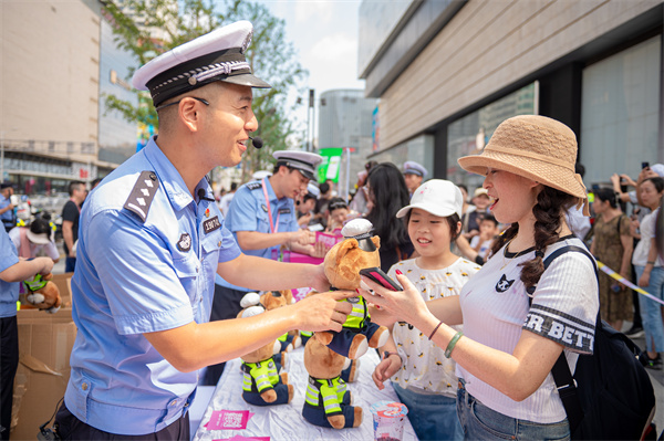 (长沙交警的形象代言人石文宇给参与互动市民的送上“交警小熊”。以上图片均由长沙交警提供)