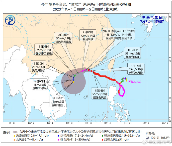 (第9号台风“苏拉”未来96小时路径概率预报图(9月1日08时至5日08时))。