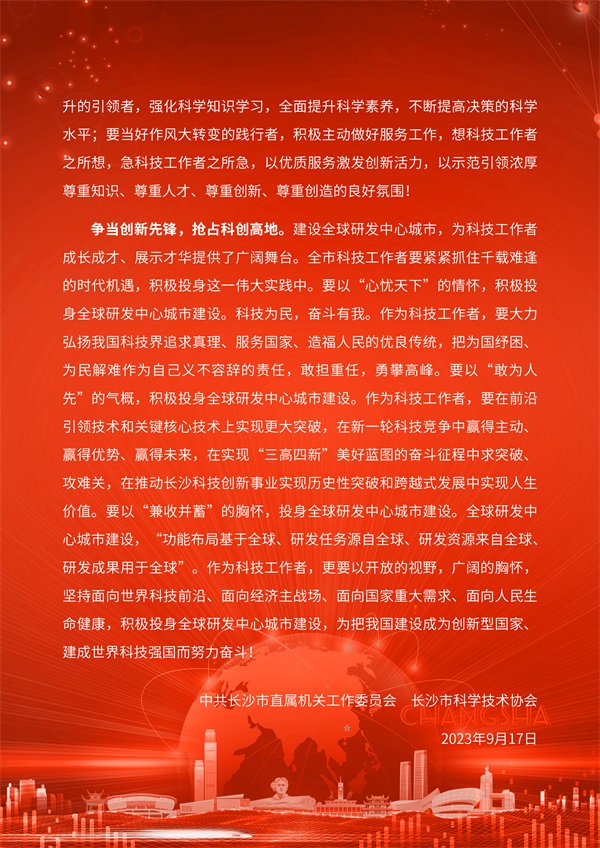 星辰在线9月18日讯(星辰全媒体记者 孙烨)9月17日,2023年全国科普日长沙主场活动启动式在湖南大学大礼堂举行。活动上,中共长沙市直属机关工作委员会和长沙市科学技术协会联合发布《全市党员干部及科技工作者建设全球研发中心城市倡议书》。