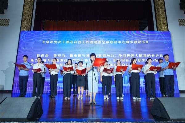 “我倡议,我担当,振奋精气神、凝聚智与力,争当思想大解放的先行者、能力大提升的引领者、作风大转变的践行者,积极投身全球研发中心城市建设,为打造具有核心竞争力的科技创新高地而努力奋斗!”市直机关工委常务副书记梁敏宣读了《全市党员干部及科技工作者建设全球研发中心城市倡议书》,并带领市直机关党组织代表及学会党组织代表共同发出倡议。