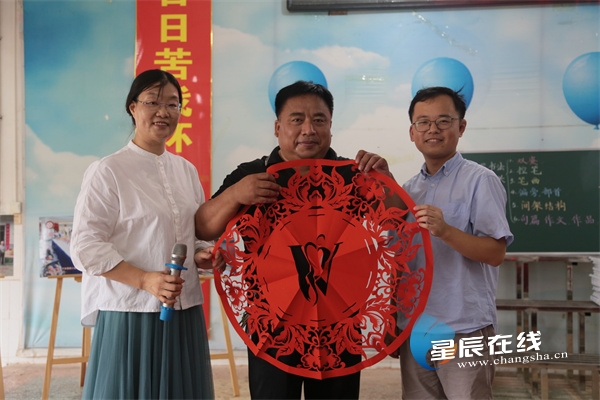 现场,由邱平辉老师精简阐述中国汉字文化历史,为孩子们讲述写好汉字的重要性;万铁军老师,讲解皮影戏的发展历史,皮影的制作并在现场拉起二胡,随着皮影的舞动现场的气氛到达高潮,掌声不断;而作为宁乡非遗代表性传承人周斌则分享了他的剪纸艺术,并向学校赠送了带有沩中LOGO的剪纸作品。