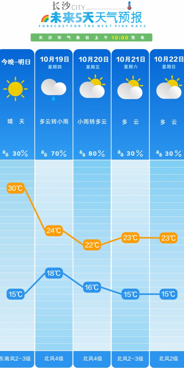 星辰在线10月18日讯(星辰全媒体记者 李政伦)最近几日长沙白天的气温持续升高,“秋燥”也越来越浓。虽然日间的最高温度达到了30℃左右,但昼夜温差达到了15℃左右。别看现在阳光正好,冷空气其实正在“蠢蠢欲动”,后期将会迎来降温降雨天气过程,届时雨水、大风都将悉数登场。