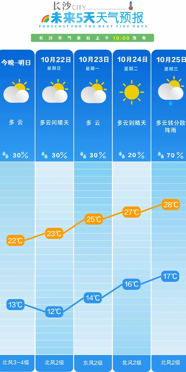星辰在线10月20日讯(星辰全媒体记者 李政伦)前两日的长沙还是艳阳高照,今日出门却已是风雨皆至,让人感觉仿佛在两季间穿梭。前两天最高气温还有30℃,今天最高气温仅为20℃出头,在北风中,人体感觉清凉了许多,很多市民朋友已经穿上了秋装外套,深秋的氛围似乎更加浓厚。未来一周,气温依旧将是这样起起伏伏的波动模式。